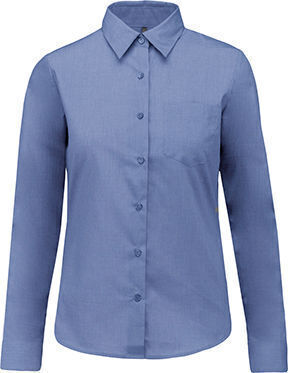 Chemise femme. Col chemise non boutonné. Boutons ton sur ton. Poche poitrine côté gauche en V. Poignet réglable à angles arrondis avec patte de manche indéchirable. 1 bouton de rappel. Bas arrondi.