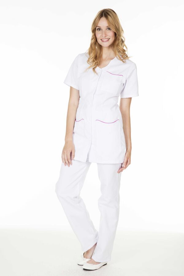 Tunique femme. Encolure fantaisie ton sur ton. Fermeture milieu devant par 5 pressions ton sur ton. 2 poches basses plaquées avec passepoil contrasté. Manches courtes. Coupe cintrée. Longueur : 80 cm.