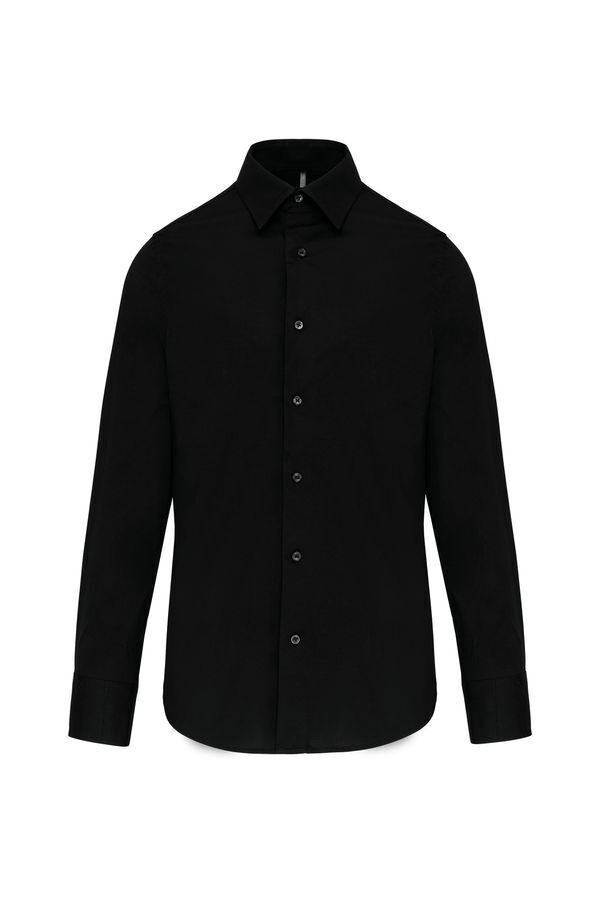 Chemise homme. Col avec pointe de col baleinée. Boutons ton sur ton. Empiècement dos double. Pinces taille dos. Finition coutures rabattues. Manches longues, poignets à angles abattus à 2 boutons avec patte de manche capucin boutonnée. 2 boutons de rappel. Bas arrondi.