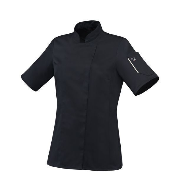 Veste femme à col officier. Fermeture asymétrique par pressions cachées. Découpes princesse devant et dos. Pinces poitrine. Poche sur manche gauche. Manches longues.