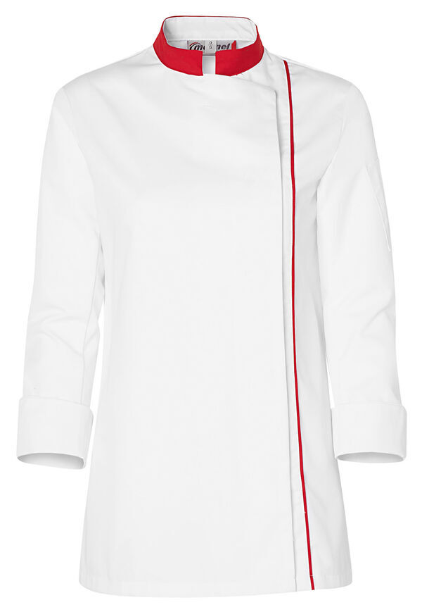 Stock : Livraison 48/72h Livraison sous 15 jours ouvrés selon disponibilités usine Veste femme avec col officier et liseré vertical contrastants. Découpe princesse au dos. Fermeture par 6 boutons-pression cachés. Manches longues, œillets d'aération sous les bras, bas de manches arrondis. 1 poche stylo sur la manche gauche.