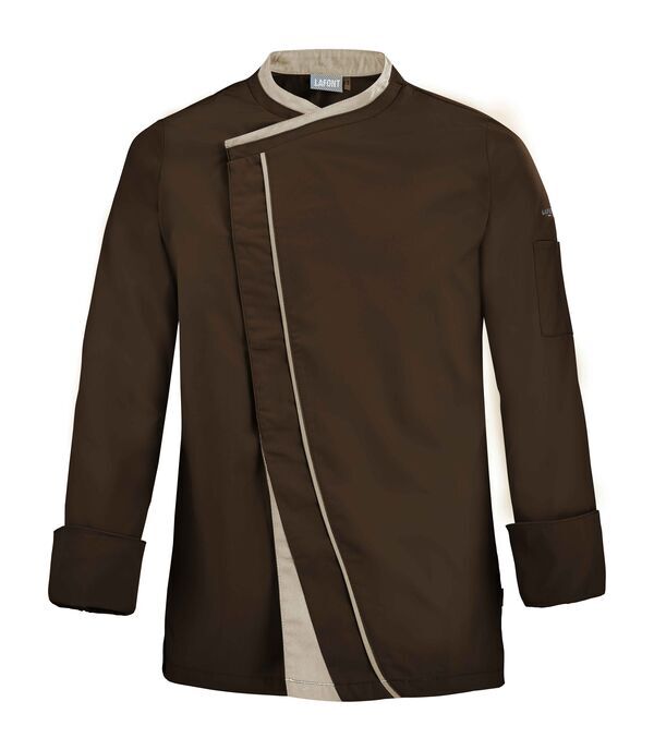 Veste homme à effet double col. Fermeture croisée par grippers cachés, double empiècement milieu dont angle bas contrasté et biais contrasté sur toute la hauteur. Fentes côtés renforcées par un twill jacquard. Oeillets d'aération brodés sous bras. Manches longues, poignets rapportés avec détails contrastés. Bas de manches à revers.