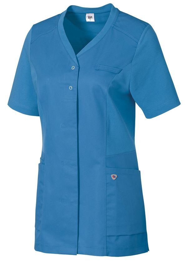 Stock : Livraison 48/72h Livraison sous 15 jours ouvrés selon disponibilités usine Tunique bi-matière coupe femme. Encolure en V. Fermeture par patte à boutons-pression dissimulée, dont 2 boutons-pression visibles. Empiècements en piqué, 2 grandes poches latérales dont 1 avec poche pour bip, passant pour badge. Manches courtes. Longueur : 68 cm.