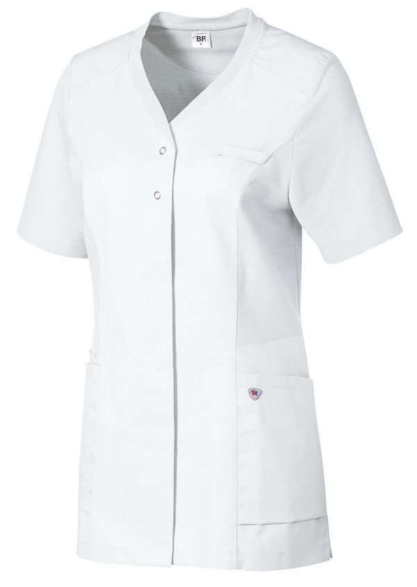 Stock : Livraison 48/72h Livraison sous 15 jours ouvrés selon disponibilités usine Tunique bi-matière coupe femme. Encolure en V. Fermeture par patte à boutons-pression dissimulée, dont 2 boutons-pression visibles. Empiècements en piqué, 2 grandes poches latérales dont 1 avec poche pour bip, passant pour badge. Manches courtes. Longueur : 68 cm.
