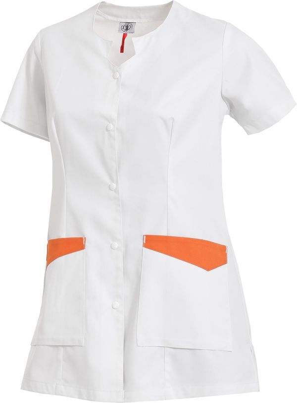 Stock : Livraison 48/72h Livraison sous 15 jours ouvrés selon disponibilités usine Tunique coupe femme. Encolure fantaisie. Pinces devant et dos. Fermeture devant par pressions plastiques. 2 poches basses, soufflets bas de poche et parements contrastés. Manches courtes. Fentes côtés. Longueur : 76 cm.