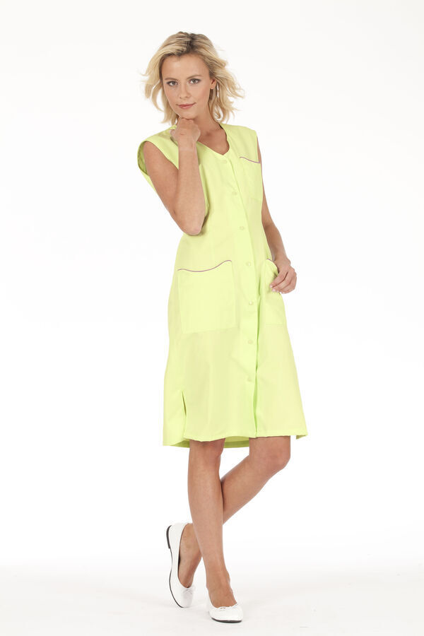 Blouse femme. Encolure fantaisie. Fermeture milieu devant par 7 boutons-pression couleurs ton sur ton. Poche poitrine avec passepoil contrasté. 2 poches basses plaquées avec passepoil contrasté. Fentes côtés. Sans manches. Coupe cintrée. Longueur : 100 cm.